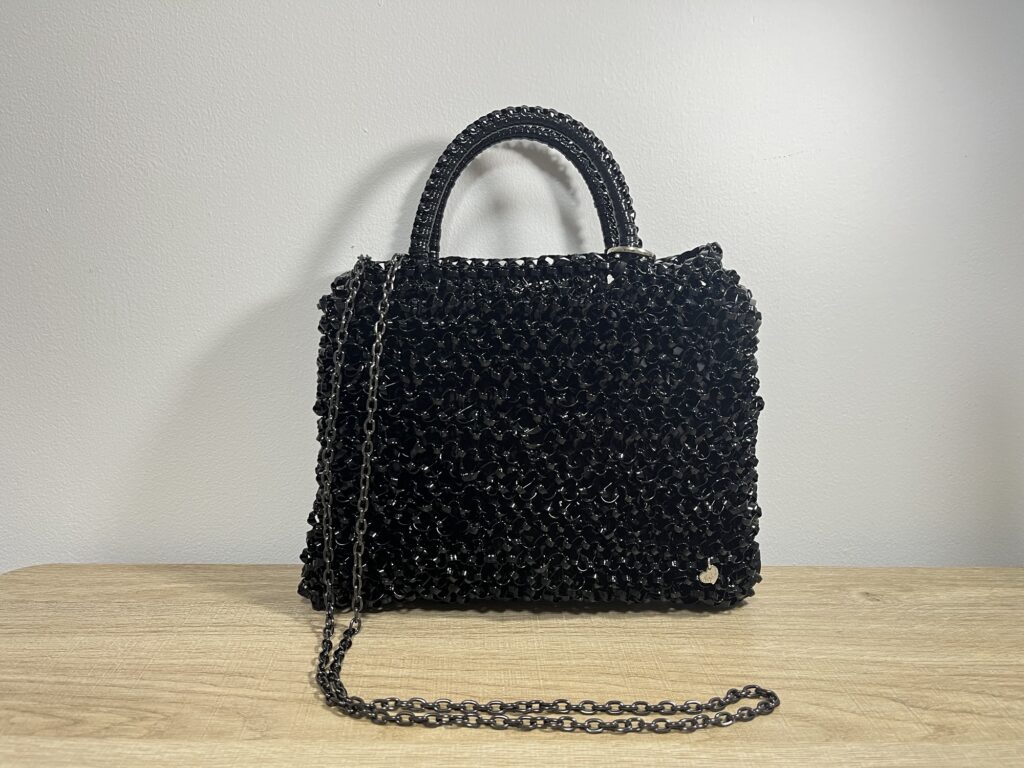 ラメルヘンテープ エナメルブラック3mmで作ったワイヤーバッグ風ハンドバッグの制作記録の一部です。
