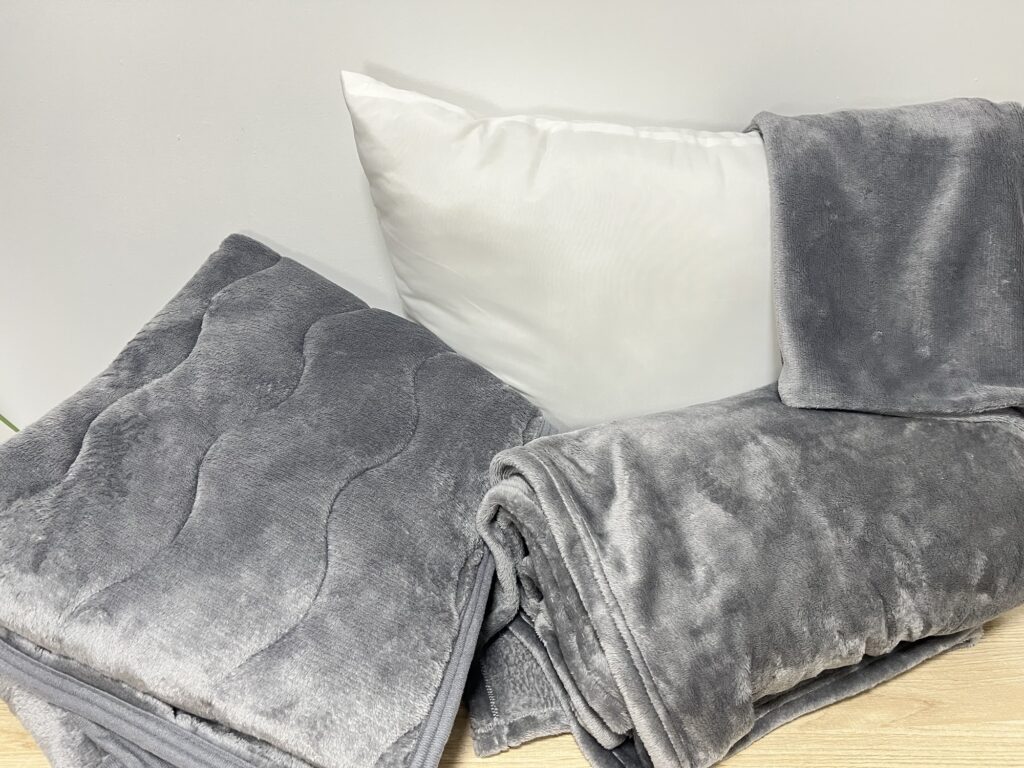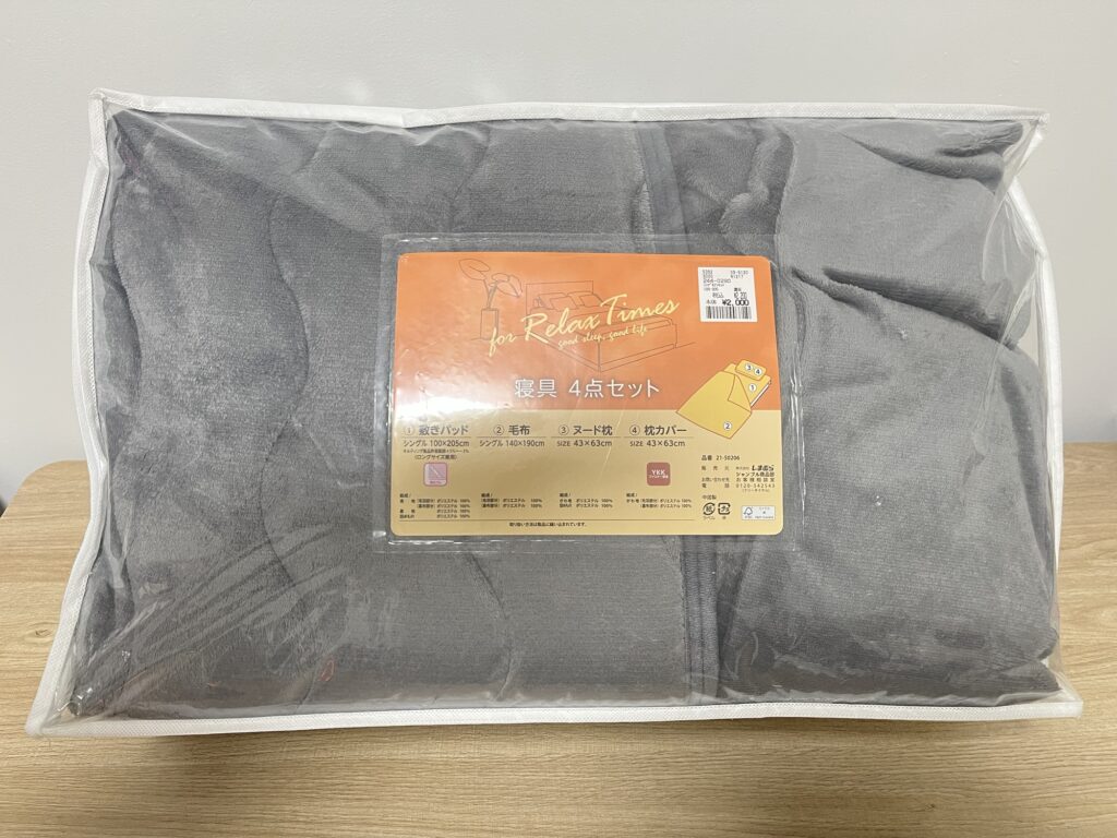 敷きパッド・毛布・まくら・まくらカバーが入って2,200円でした!