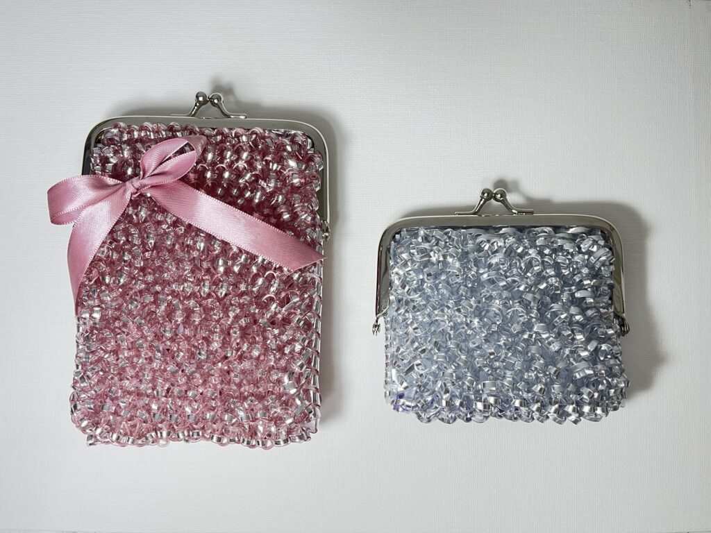 ちなみに、ピンク色のポシェットは1.5ミリで、右側のハンドバッグは3ミリで編みました。