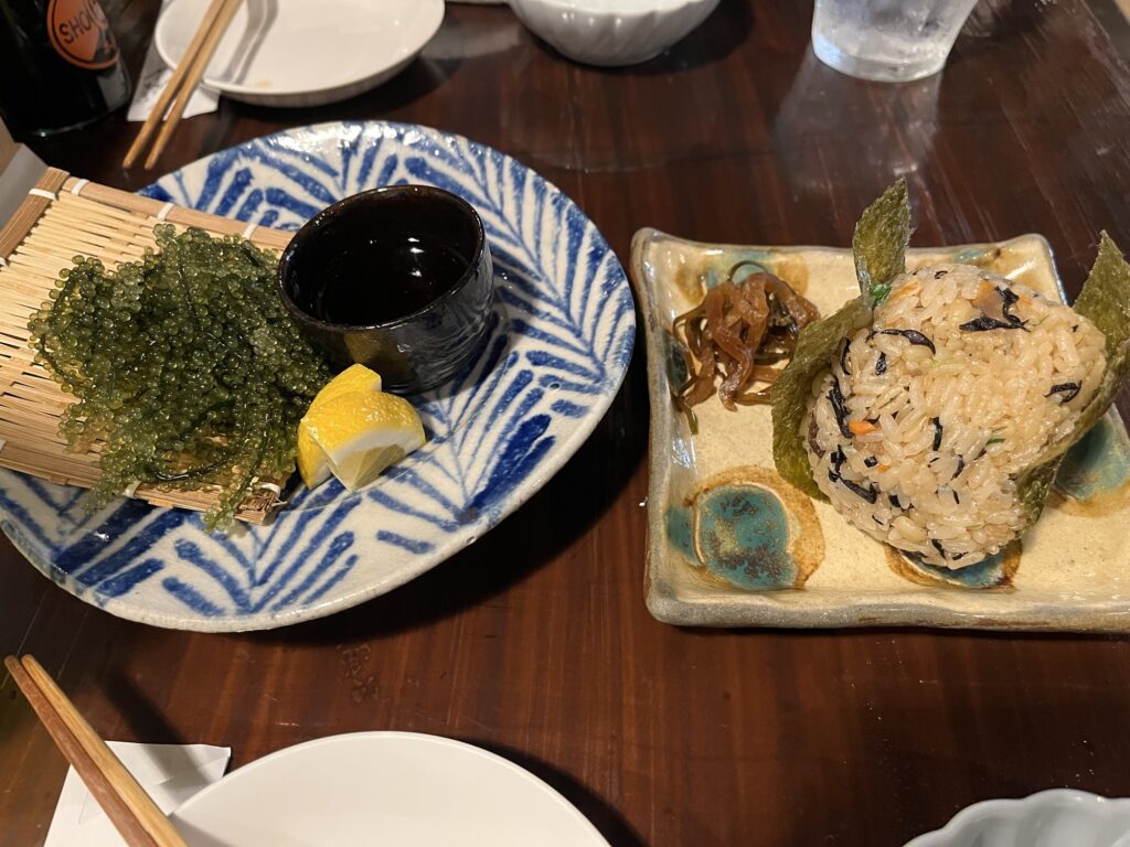 海ぶどう、ジューシーおにぎり、ゴーヤチャンプルー、ミニおんなラーメン(塩)などを堪能。